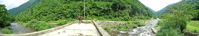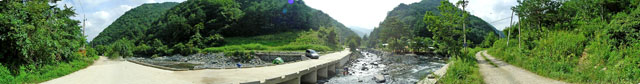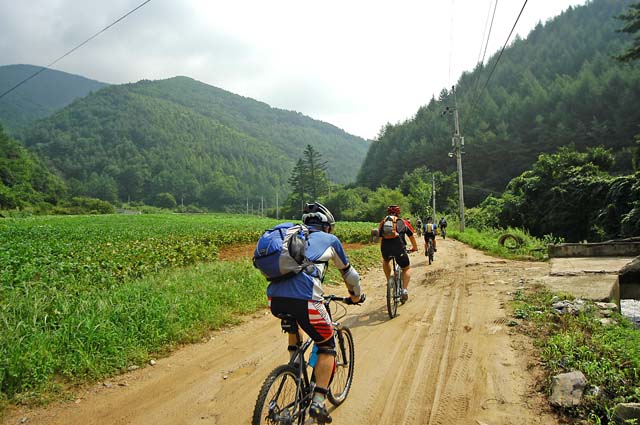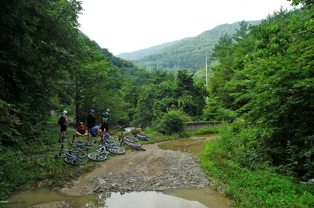 내려가는 길의 경사가 만만치 않다. 속도를 냈다간 돌이며 패인 구덩이에 앞바퀴가 빠지기 쉽상이다. 작년 280때 숙암분교를 출발한 랠리전사들이 새벽에 이길을 올라왔다는게 안스럽기까지 느껴진다. 급한경사의 자갈밭 딴힐을 한참하고 나면 콘크리트 포장로 딴힐이 기다리고 있다. 최대한 속도를 내어 딴힐을 시도해 본다. 멀리까지 쭉 뻗은 직선 포장로를 한껏 달려본다. 몇구비를 지나고 줄기차게 내려오다 보면 어느새 원점회귀 벗밭골 다리를 지날 수 있다. 그대로 다리를 지나 단임골로 다시 열심히 포장로를 달린다. 왼쪽에 오대천 탁트인 물에 캠핑을 즐기는 사람이며 골짜기 물이 햇볕아래 넘실거린다.