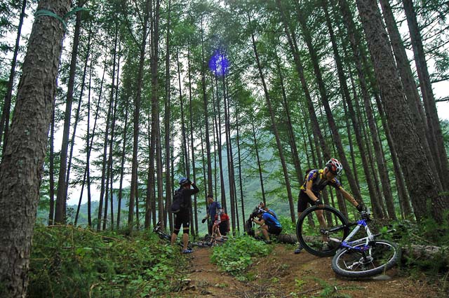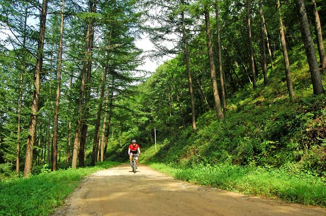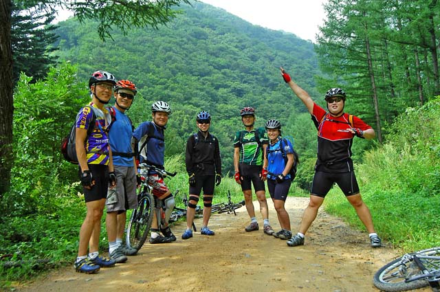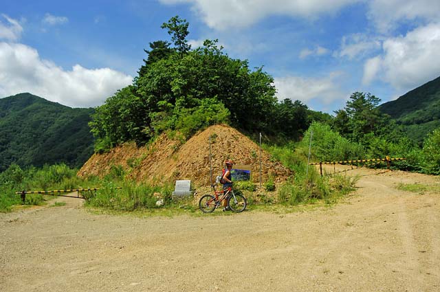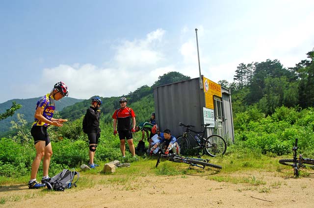 다시 길을 올라 모퉁이를 돌아서니 아까 먼저 올라간 산림청 임도관리 차량이 도로를 막고 주욱 늘어서 있다. 수고 하시라는 말과 함께 잔차를 끌고 차량을 피해 오르려는데 관리하시는 분중에 한분이 앞으로 가야할길이 상태가 좋지 않다고 살며시 경고를 해준다.. 흠흠.. 나는 거만하게 그정도 쯤이야라는 맘으로 “길만 있으면 어디든지 갈 수 있습니다.. 허허..”라고 거드름을 핀다. 최근에 거의 임도관리가 하지 않아 우리의 앞길을 성의껏 걱정해 주고 계신듯 한데 나는 가볍게 그말을 무시해 버린 것이다.ㅠㅠ