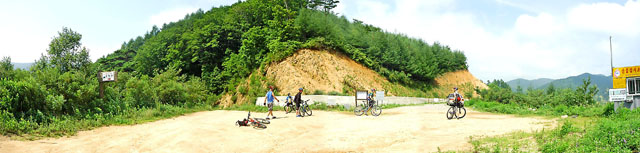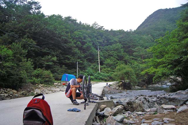 다시 출발하려는데 단월낭자의 타이어가 바람이 빠져 있다. 출발전 세번이나 패치를 했는데 번번히 바람이 빠져 애먹었는데 결국 여기까지 와서 다시 펑크가 나버린다.^^ 한부위에 패치를 네번째 한다. 아마 기록일꺼다. 이박사님이 패치하고 있는 사이에 나는 슬며시 땅바닥에 누워본다. 밤새 잠을 두시간 밖에 못잔지라 휴식만 하면 눈이 자꾸 감긴다. 하지만 잘 수는 없다..아이구 졸려…