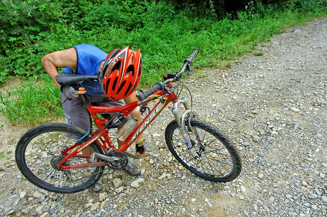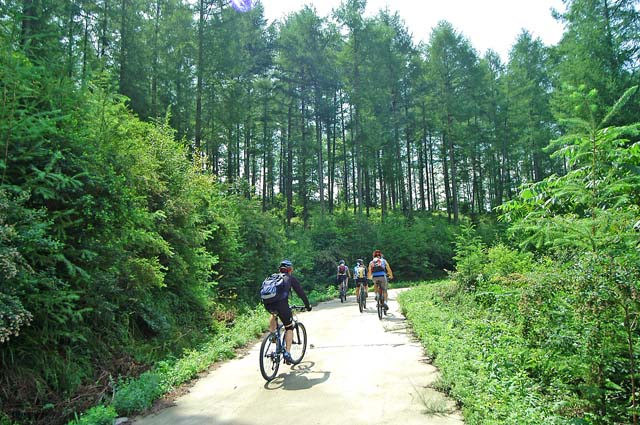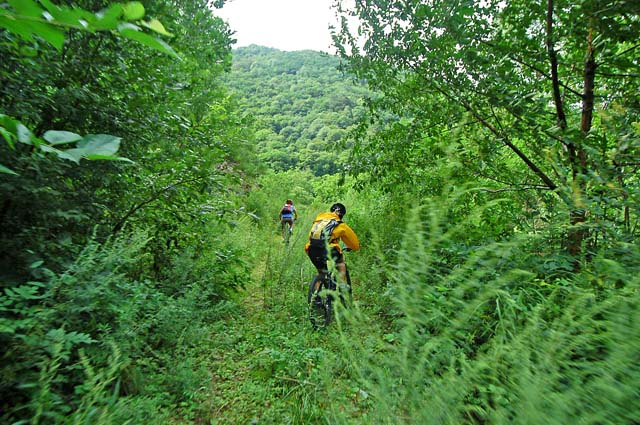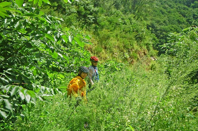 잡초가 키보다 무성하게 자라있다. 아예 도로를 막고 우리를 못지나가게 한다. 수풀에 조금 긁히는 것은 이미 각오한지라 그대로 돌진해서 넘어가고 뚫고 가고 한다. 어떤곳은 길이 아예보이지 않기도 한다. 개울물 소리가 들리면 계곡으로 떨어지진 않을까 걱정도 해야하고..^^ 해를 맞으며 8부능선을 돌아가는 길은 잡초가 덜하다가 이내 반대편 그늘에 들어서면 엄청난 수림이 기다린다. 언젠가부터 팔이며 다리에 날카로운 가시가 걸린다. “악!!” 소리를 지르며 길을 지나고 난후 다리며 팔에는 핏자욱이 선명하다. 가시풀이 긁어대는 고통이 생각보다 상당하다. 길을 진행할 수록 가시풀이 점점더 많아지고 생각지도 않던곳에서 우리는 비명을 지른다.. 반팔에 반바지에 살은 완전히 무방비 상태다.. 임도를 올라야 하는 업힐에 대한 부담보다 잡초며 가시풀에 대한 부담이 일행을 더욱 압박한다. 하루빨리 이 잡초숲을 벗어나고 싶다는 생각으로 점점 머리속은 채워져 간다.