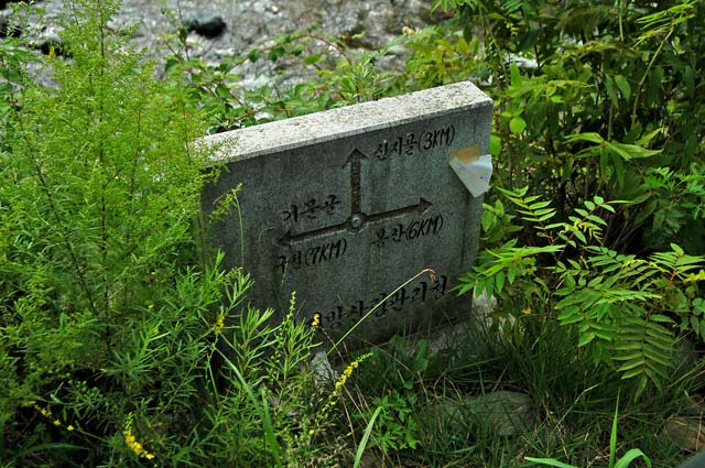 이국적으로 쭉쭉뻗은 수림사이에 넑직한 비포장로가 마음을 편안하게 한다. 근심을 털어내고 가볍게 페달링을 흥겹게 하다보면 점점 길의 경사가 더해간다. 직선로를 달리다 큰 회전을 한번 하다 다시 쉬었다 간다. 이어서 조금 오르니 이정표가 보이고 삼거리가 보인다. 왼쪽으로 오르는 길이 있는데 이정표에는 명칭이 지워져 있다. 나중에 확인할 길이지만 왼쪽으로 가면 거문초교 봉산분교로 바로 내려가는 길이다. 이정표에 푸른색 페인트로 지워놓은 이유는 알 수 없으나 길상태가 안좋을 겉 같다는 느낌이 든다. 일행은 오른쪽으로 간다.