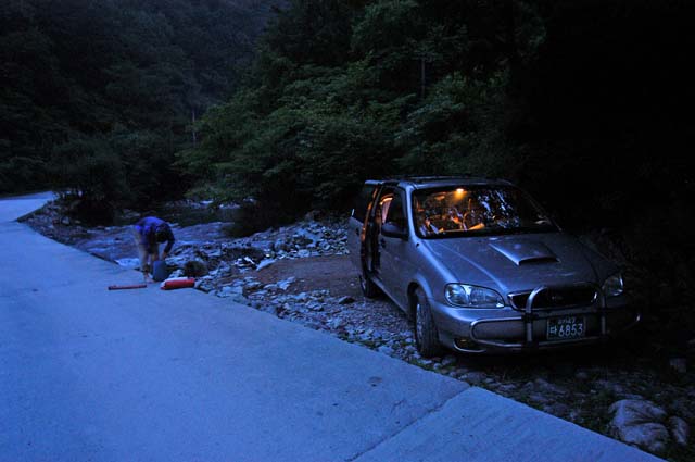 단임골 방향으로 접어들때 즈음에는 어둠이 내리고 있었다. 오대천을 건너는 벗밭골다리를 건너 왼쪽으로 간다. 왼쪽 오대천을 끼고 콘크리트 포장로를 한참 진행하다 보면 단임골 입구에 즈음에서 비포장길로 바뀐다. 단임 계곡물이 시작되는 근처에 차를 파킹하고 오늘 비박을 하기로 한다. 대충 씻고 비박맴버들이 각자 준비해온(난 라면하나 들고왔다.^^) 부식을 정성스럽게 조리해서 꿀맛의 야전식사를 하고 준비해온 텐트에서 비박을 감행한다. 개울물이 부서지며 흘러가는 소리를 자장가 삼아 단임골계곡에서 이른잠을 청한다. 침낭을 베고 자다 새벽에 추워 결국 덮고 잔다.^^ 계곡의 새벽은 생각보다 더욱 서늘했다.