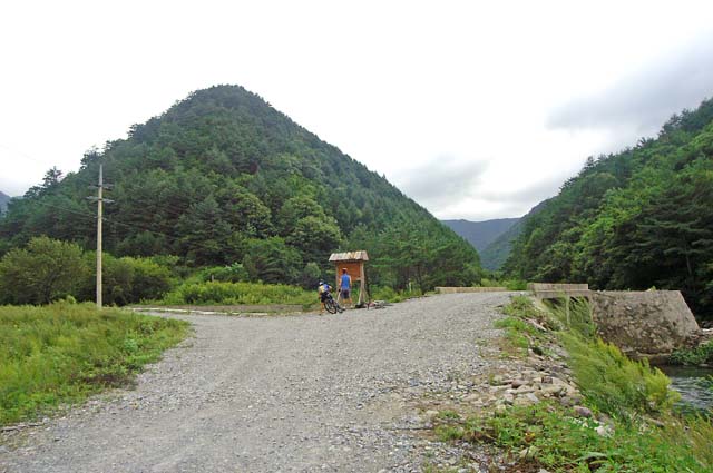 바로 이곳이 출발지인지라 이동거리도 없고 추가시간도 필요없이 바로 라이딩이 시작되었다. 단임골 초입은 큰 업힐이 없다. 완만하게 골짜기를 따라서 이동하면 그만이다. 개울을 오른쪽에 끼고 가다 다리건너 다시 왼쪽에 두고간다. 물의 맑음은 두말할 필요도 없다. 엄청난 수량도 역시 한몫을 한다. 개울폭도 여느 골짜기와 달리 넓기까지 하다. 강원도 고산에서 뿜어져 나오는 계곡의 지류가 이곳에 와서 그 역동적인 위용을 자랑하고 있다. 새벽나절이라 서늘한 도로를 오르다 보면 단임골도 사람의 손길은 피해갈 수 없음을 알게 된다.