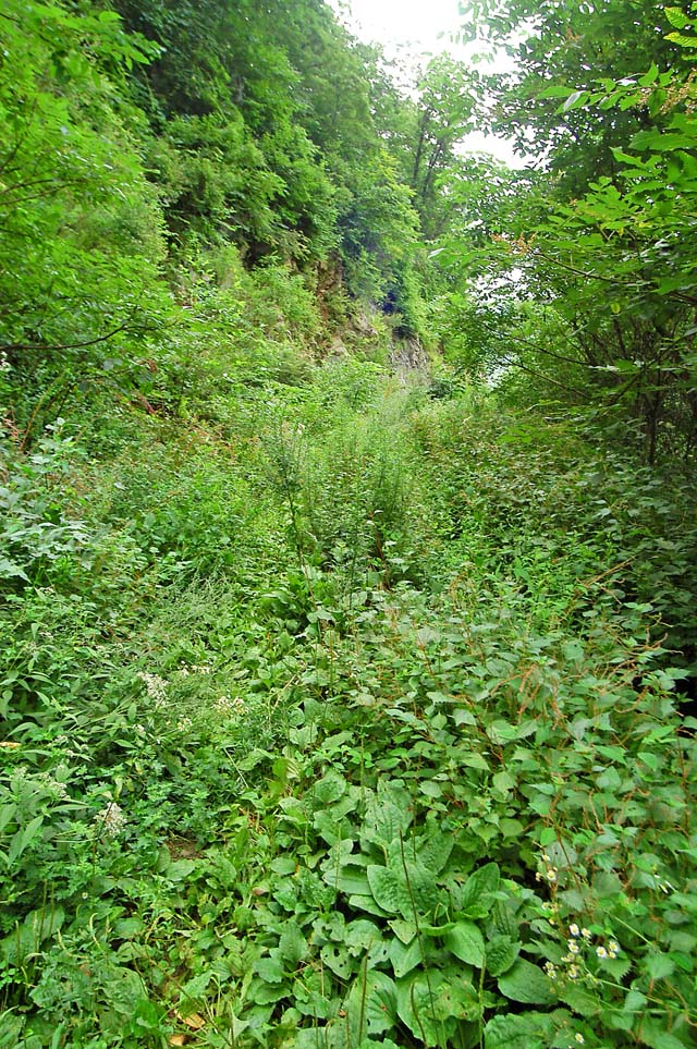 출발하고 나면 평탄한 오솔길이 계속 이어진다. 인적도 없는 울창하고 고즈넉한 골짜기길을 계속 가자니 오른쪽에는 개울물 쏫아지는 소리가 콸콸댄다. 태백 준령의 골짜기 답게 소리의 위용도 우렁차다. 서울은 한참 더울때 인데 이곳은 수풀곳곳이 서늘함마져 감도는 오전이다.