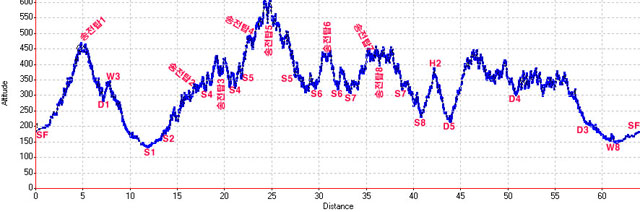 이번코스의 구간별 고도변화 추이입니다. 송전탑을 몽창다 올랐다고 가정하니 무려 64Km가 나오더군요. 짐승의 길을 선택하신 라이더분들에게는 더할나위 없이 복터지는 날 되겠습니다. 질퍽 끈끈한 라이딩이 기대됩니다. 도토리 후반부가 아름답게 포함되니 2기 시절의 송전탑보다는 빡센거 아시죠? 인간라이더 분들은 후반 도토리에 대비해 적절한 체력비축이 무엇보다 중요합니다. 고도추이 잘보시면 송전탑을 모두 빼고나면 1주차의 도토리와 마찬가지의 완만한 비단길임을 알 수 있습니다. 취향껏 즐기시길 바랍니다.^^