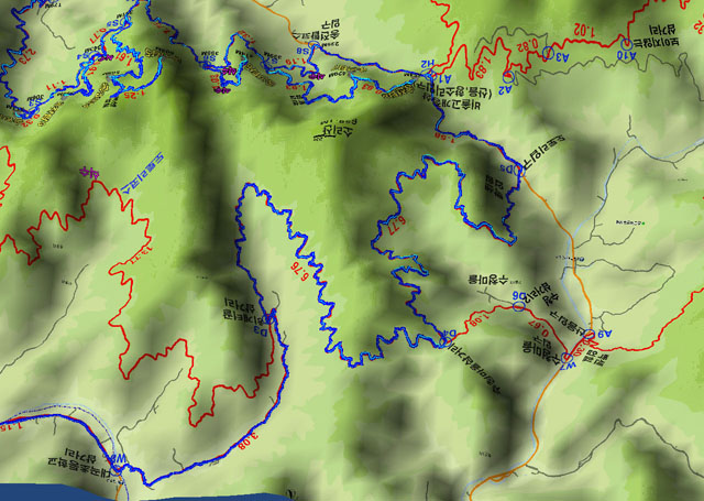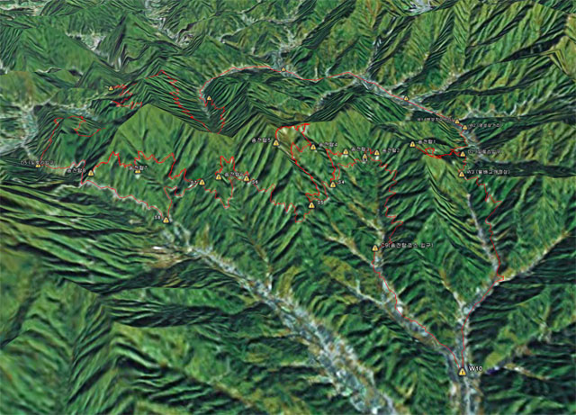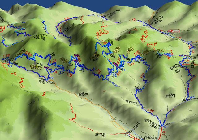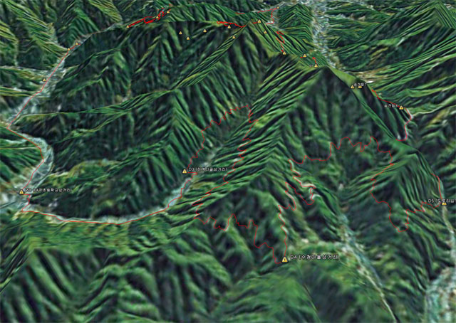 송전탑코스 남측사면 3차원 조감도입니다. 뭐 복잡해 보이긴해도 송전탑오르락, 내리락길의 경사도나 길이를 어림 짐작 할 수 있습니다.
