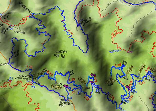 송전탑코스에서 비솔고개(H2)로 올라 도토리로 살짝 돌아가는 확대조감도입니다. 수청마을 삼거리(D4)까지 체력을 아끼면서 진행해야 할겁니다.