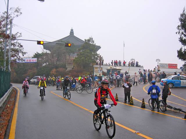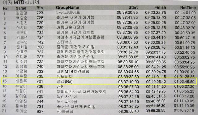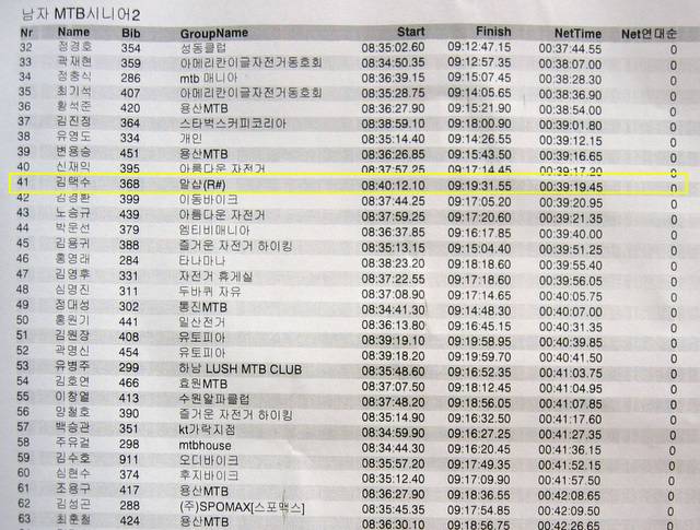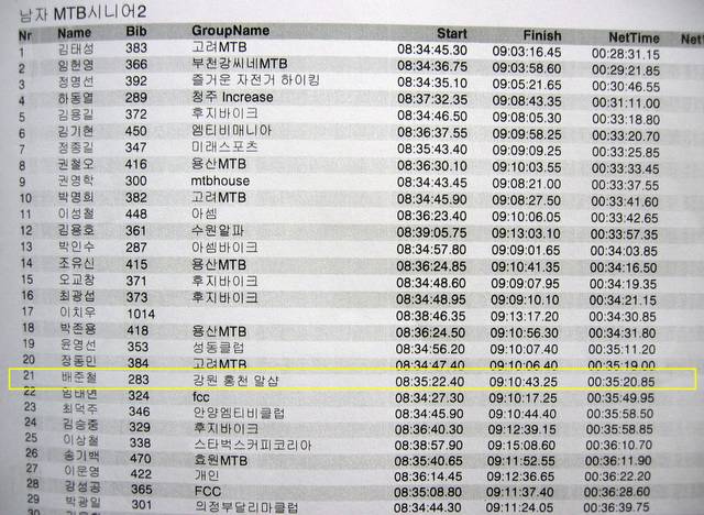 MTB시니어2에서 21위로 골인했다. 나쁘진 않은 성적이다. 하지만 순위권하고는 거리가 멀다.. 연습을 게을리한 탓이다. 김택수님은 같은 종목에서 41위를 기록한다. 시합이라고는 처음 참가한 동생이 21명중 15위에 오르는 기염(?)을 토했다.^^