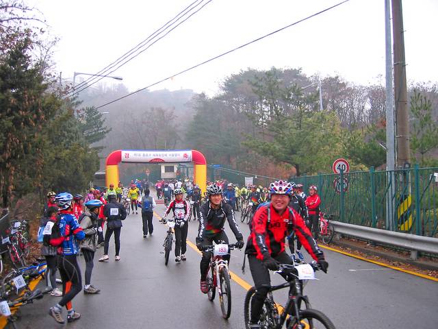 곧이어 나의 동생 배은주도 보이고 김택수님도 오신다. 택수님은 예전 졸업라이딩에도 그랬듯이 오늘도 부인되시는 분이 응원 오기로 했단다. 부부 애정이 남다르다. 그러는 동안 개회식이 거의 끝나가고 나또한 굳은 몸을 풀어본다. 거의 준비운동이 끝나갈 즈음에 출발에 대한 방송이 있었다.. 오늘 나의 판단오류는 여기서부터 시작된다. 3명씩 출발한다고 알고 왔는데 단체 출발이었다. 많은 선수들이 우르르 스타트지점에 이미 내려서서 출발준비를 하고 우린 뒤늦게 출발임을 알고 꾸역꾸역 준비를 해야 했다.