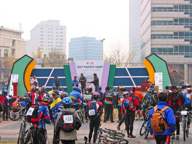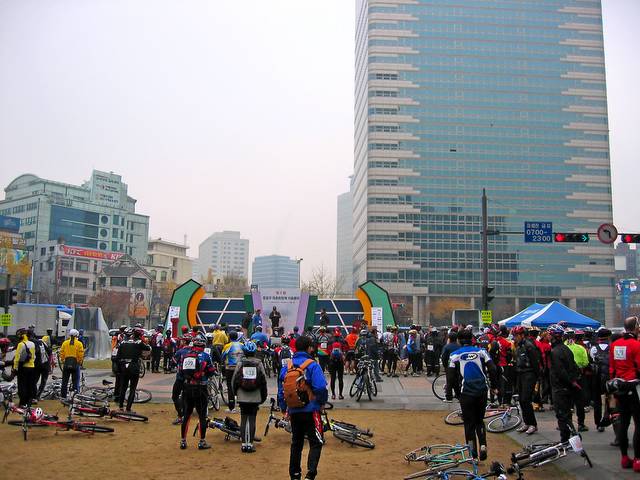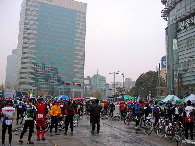 아직 젖어있는 로드에서 튄 흙물이 고글에 부서진다. 입으로도 들어가 아작아작 씹힌다.. 많은 수의 라이더들이 경쟁하듯 달리기 때문에 급작스런 좌우 크로싱이나 추월시 조심해야 했다. 곳곳에 자그만 사고들도 여기저기서 일어나고 신경쓸 겨를도 없이 고속페달링에만 열중한다. 경사가 거의 없는 로드를 타고 광화문까지 진행은 무난하게 이루어 진다. 중간에 차량통제가 원할하게 이루어 지지 않은 탓인지 버스나 승용차와 같이 달리게 되는 위험한 상황까지 발생하긴 했지만 크게 문제되진 않았다.