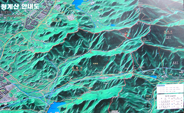 이전에 봐두었던 청계사앞 청계산 조감도간판을 사진에 담는다. 오늘 갈길의 지도는 이것으로 확보되었다. 청계산 전체의 구간별 거리며 등산로 내역이 상세하게 나와 있다. 매표소까지 다시 딴힐을 내려가자니 올라올때 보다는 덜하지만 그래도 차가 계속 걸리적 거린다. 평상시 평일밤에 오면 차한대 없는 적막한 길인데 토요일 정오의 청계사 입구는 차와 등산객들로 북적인다.