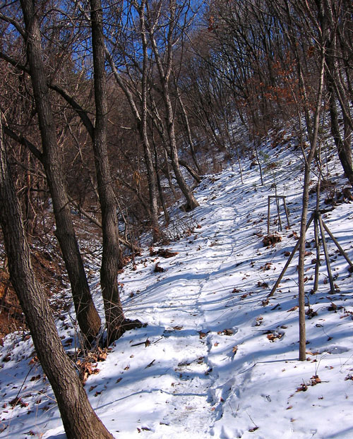 조금 쉬었다 등산객들의 눈길이 따가워 이수봉쪽으로 잔차를 끌고 간다. 조금 타고 가다 다시 끌어야 된다. 이수봉길도 호락하진 않다. 겨울만 아니라면 타고 갈만한 길도 많아 보이지만 빙판이나 눈길이 워낙 어렵다. 업힐도 딴힐도 수월치 않다. 하지만 아까 삼거리 직전의 길보다는 그나마 사정이 낳아져 금새 이수봉에 이른다.