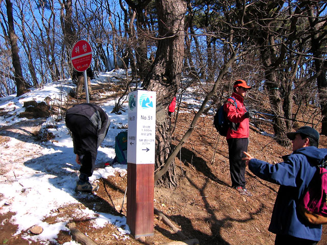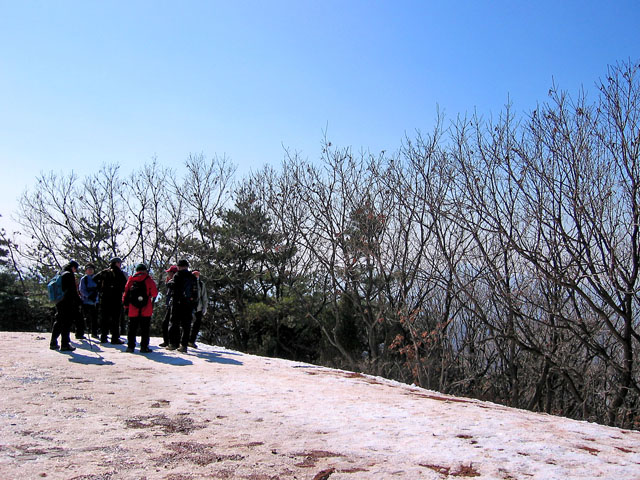 능선에 이르러 부드러운 싱글길을 상상했건만 전혀 아니었다. 조금 가다 보면 어느새 절벽에 바위에 기어 오르고 끌고 오르게 미끄러져 올라야 했다. 등산객분들도 상당히 많았는데 대부분 아이젠을 장착하고 오르는 분들이었다. 내 여름용(날씨가 푸근하여 여름클릿신발을 신고 나왔다.)신발에도 앞에 징이 두개나 밖혀 있어 그나마 다행이었다. 오른때는 이놈이 얼음이며 눈을 찍어주며 제역할을 해준다. 하지만 내려갈때는 속수무책이다. 특히 곳곳에 눈이 얼어 빙판인 급사면에서는 거의 엉금거리며 기어다녀야 했다. 헬기장까지 겨우 올라 잠시 쉬어본다.