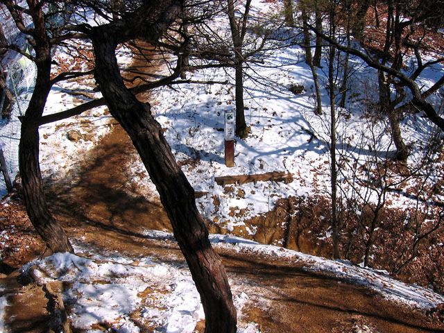 하지만 박혀도 내리막에서는 뒷굼치로 내려서야 하는지라 영 소용이 없다. 좌충우돌하면서 가파른 내리막을 내려서고 또 내려서니 드디어 청계사와 정신문화연구원 방향 사거리 갈림길에서 직진하여 하오고개와 원터골로 갈라지는 삼거리에 도착한다.