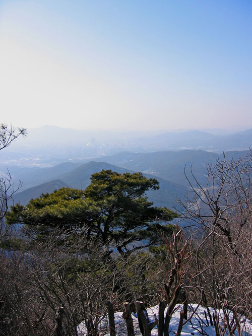 이수봉에서 국사봉이 저너머 보인다. 멀리 백운산, 광교산도 눈에 들어온다. 오늘 국사봉을 돌아 하오고개나 하우현 성당(원터골)로 내려설 예정이다. 지금까지는 생각보다 험하긴 해도 예정대로 잘 진행하긴 했다. 국사봉으로 가는길이 이수봉에서 빤히 내려다 보이고 길도 고만고만해 보인다. 국사봉방향으로 접어드니 등산객수가 현저히 줄어든다. 등산로에도 눈이 수북하고 인적이 많아 보이지 않는다. 왠지 길을 잘못들었나 하는 우려마져 든다. 하지만 간간히는 보이는 지라 지도와 육감을 믿고 그대로 가본다. 이길도 만만치 않다. 길의 상하 표고차가 들쭉 날쭉이다. 한참 올랐는가 싶으면 금새 절벽처럼 내려서야 한다. 사람의 발길으 드문지라 눈이 녹지않고 얼음과 함께 바위위에 그대로 다져져 있다. 갈수록 태산이라는 맘만 가득하다. 하지만 이젠 몇시간 동안 걸어온 길에 몸이 적응되어 간다. 메고 끌고가 자연스레 라이딩의 일부가 되어 가고 있었다. 이래서 이런곳도 가나보다 하는 심정이 되어 간다. 벌떡선 바위덩어리 오르막도 눈과 얼음이 수북한 미끄러운 절벽같은 돌덩어리 내리막도 숨과 근육이 팽팽히 끊어질 듯 이어졌다 다시 이어지며 하나둘 넘어서다 보니 금새 국사봉이다. 좁은 국사봉 정상에 많은 사람들이 빽빽히 들어서 있다. 과천에다 의왕쪽이 빤히 보인다. 멀리 관악산도 가까이 눈에 들어온다. 인근에서 높은 곳에 오른 감흥에 잠시 젖다가 다시 하산길로 나선다.