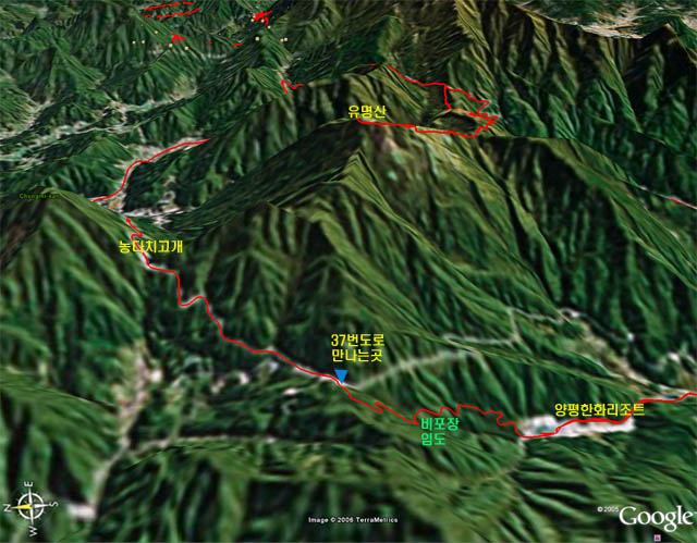 유명산 정상에서 11시40분경에 출발하여 배너머고개 삼거리를 거쳐 헤어핀이 굽이굽이 아름다운 351번 온로드(추워서 그런지 이민주선생님의 79Km의 속도에 대한 의문은 아직도 그대로 남았다..^^)를 타고 딴힐 37번국도에서 아까 한화리조트까지 1시간만에 순식간에 회귀한다. 말그대로 하산길은 추위와의 사투였다. 다행히도 산아래에 부근에서는 비가 잦아들어 좀 덜하긴 했지만 37번과 만난후 한화리조트까지 들어설 즈음에는 완만했지만 모두 업힐구간이었음에도 두사람 모두 몹시 떨어야 했다. 도착시간 12시 44분이었다.
