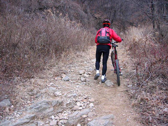 리조트 북쪽 끝으로 가면 뒤켠에 돌무더기 업힐코스가 보인다. 몸도 채 풀지 않았는데 농다치고개로 오르는 3Km여의 둘탱이 업힐은 부담스러웠다. 초반은 그럭저럭 오를만 했지만 갈 수록 시험에 드는 구간이 많아진다. 몸풀기도 전에 몸을 혹사하지 않겠다는 간사함이 맘 깊은 곳에서 올라온다.