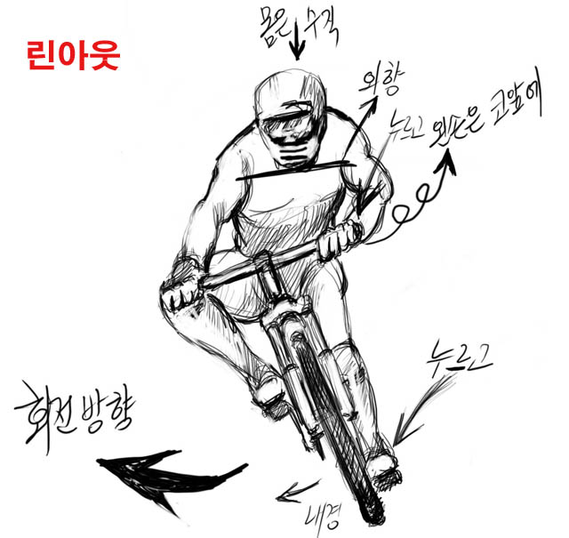 일단은, 핸들바를 코너링 방향과 일치시키되 몸을 세워 눞힌 차체의 핸들바를 찍어 누르는 린 아웃 턴을 기본으로 라이딩하시길 권해드립니다.