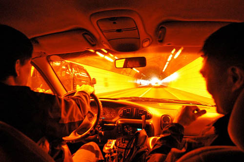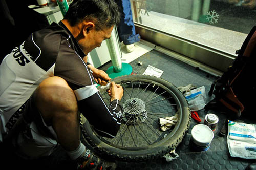 명성터널을 억지로 3인방이 통과하고 있자니 나무판이 타이어에 밟힌다. 못이 있었는지 정선생님 타이어가 펑크.. 터널 중간부터 끌면서 빠져 나온다. 왠지 오늘 일진이 않좋다. 하지만 우리의 앞일이 펑크하나로 포기될 정도로 가볍지 않은지라.. 열심히 튜브 교체하고 바로 출발..