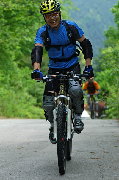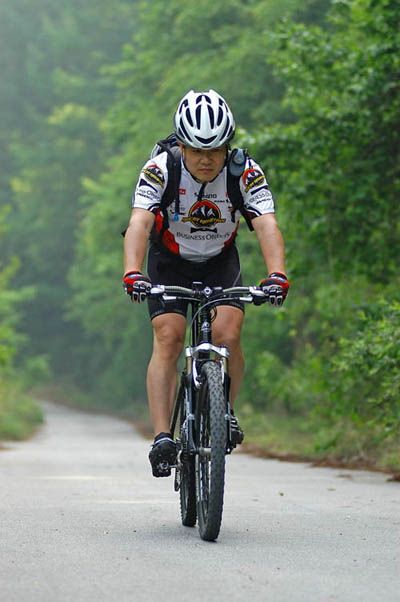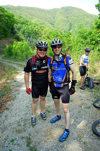 오늘의 카리스마 에티엔되겠다. 29세라고 본인이 얘기한다. 한국나이로는 30세즈음 될 것이다. 캐나다에서 원래 MTB로 2년간 타다 로드사이클에 맛들여 5년동안은 로드만 탔다고 한다. 로드사이클의 짜릿한 속도감에 푸욱 빠져서 사는 듯 하다. 주말에 보통 100여키로씩 동료분들과 타고 다닌다니.. 그 열성도 어지간 한듯 싶다. 그래서인지 왠만한 로드업힐은 햄머링을 올라 버린다. 힘 짱이다.. 내가 오죽하면 어설픈 영어로 옆에서.. 투 패스트, 투 스트롱.. 이라고 연신 떠들고 다녔을까..ㅠㅠ