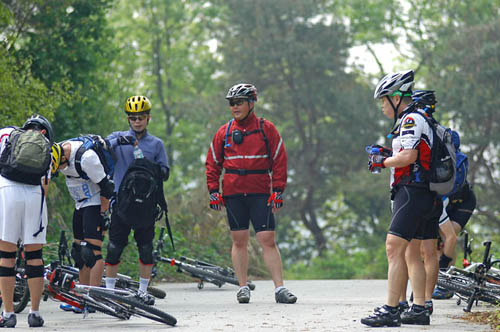 클릿이 안풀리는 지라 좌우 가리지 않고 철버덕대며 넘어지는 소리가 여기저기 요란하다. 노봉균님 이번이 세번째 자빠링이다. 왼쪽을 잘풀고 엄하게 오른쪽으로 풀석 넘어진다. 뒷드레일러 행어가 휘어 버린다. 이박사님이 강력한 힘으로 다시 펴 준다..^^