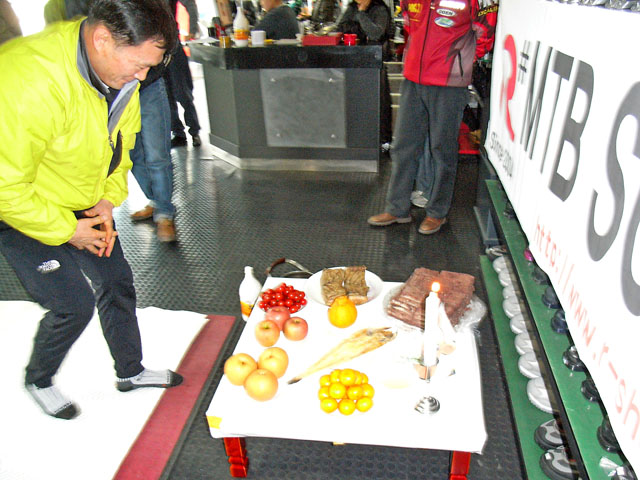 알샵사모님이 준비하신 포와 과일, 돼지고기가 한상그득 차려진다. 고사라고는 지내본적 없는 지라.. 약식으로 진행된다.