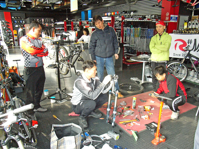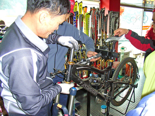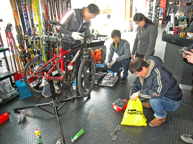 다음은 이승상님의 록키마운틴 ETX의 신형 XTR크랭크와 드레일러 교체 장착 작업이 이어진다. 신형 XTR크랭크 장착이 다소 복잡하긴 했지만 하성식님과 이박사님의 메뉴얼 분석을 거쳐 순식간에 척척 마무리하고..