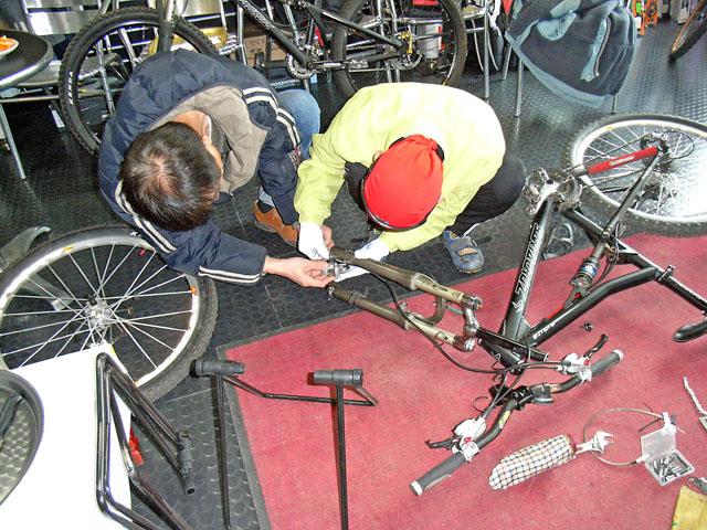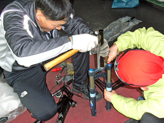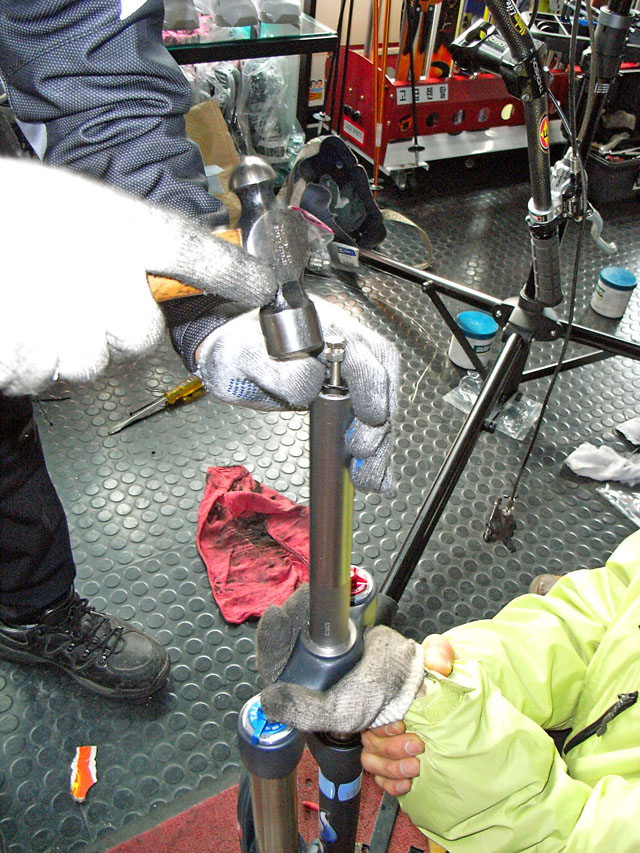 김소장님이 새로 장만하신 폭스 탈라스 RLC포크에 이박사님이 전용공구 없이 헤드셋링을 창착하시는 새로운 방법을 선보이고 계신다. 알미늄 막대를 가지고 돌아가면서 이건찬님과의 협공끝에 톡톡 치면서 장착성공.. 기지가 눈부시다.. 소장님은 시프터와 드레일러, 체인, 체인링을 스램시리즈로 올 교환하신다.. 눈부신 블러LT가 새롭게 태어나는 순간이었다.
