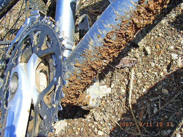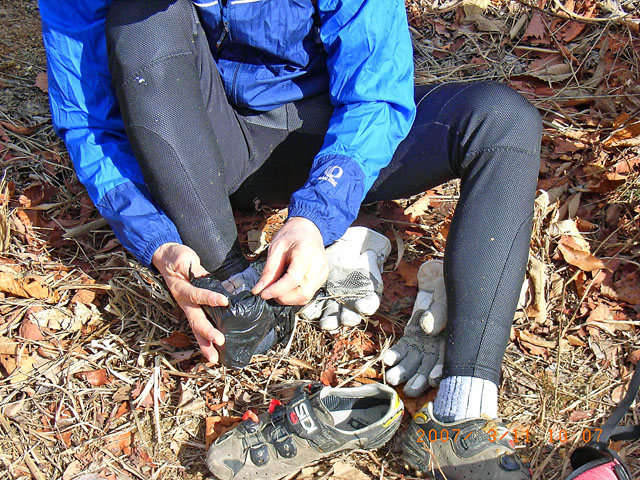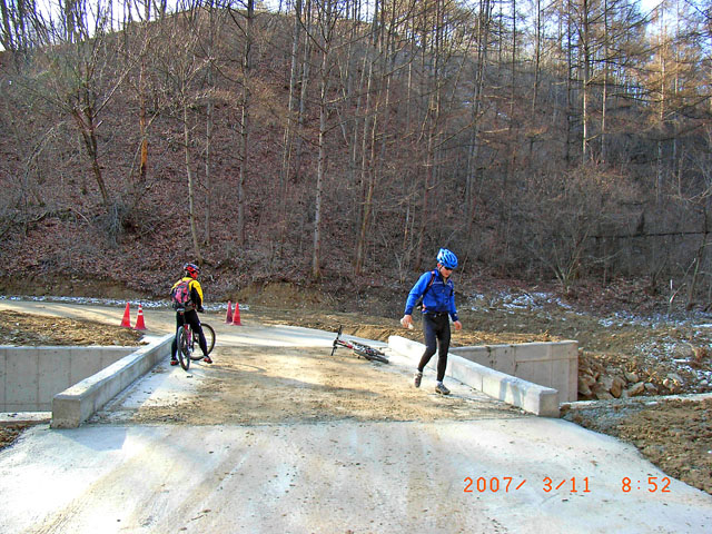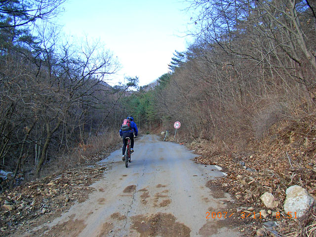 따듯한 날씨에 차들이 지나가면서 진흙위로 바퀴골을 깊게 만들어 놓았는데.. 이게 간밤에 꽁꽁얼면서 돌덩어리가 되고 얼음도 끼어 있어 자칫 잔차가 골에 잘못들어서면 방향전환이 어려워 미끄러지는 사태가 발생한다. 세사람 모두가 한번씩 그런일을 겪게 되면서 작은 자빠링을 했는데.. 유선생님이 그중 무릎에 찰과상을 입었다.. 부상이 크지 않아 다행이었지만 겨울 오전 임도에서는 노면상태를 꼬옥 확인하면서 주의를 기울일 필요가 있었다.