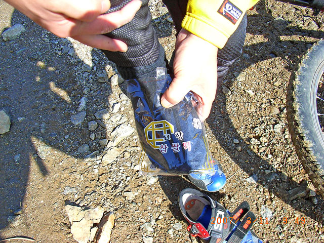 하지만 어쩔 수 없다.. 급한데로 유진복님 양말 한짝이라도 보호할 요량으로 준비해온 찹살떡으로 사이좋게 나눠먹고 남은 비닐로 발을 감싸본다. 사이즈가 딱 맞는다..^^ 아.. 유선생님 스타일 구겨지지만 추위에는 어쩔 수 없다.
