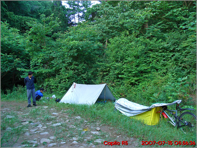 준비해간 메트리스며 텐트, 침낭은 훌륭했다. 텐트는 아늑하고 매트리스는 편안했고. 침낭은 따듯했다.. 계곡물소리를 밤새도록 마음을 쓰러내린다. 비가 오는건지 물이 흐르는 건지 나중에는 혼란스럽기까지 하다. 그래도 야전임을 느끼기 어려울 정도로 편안한 밤이다.