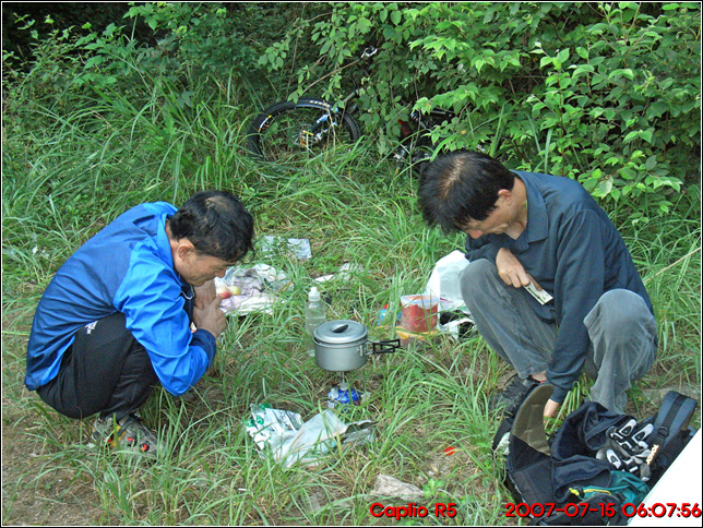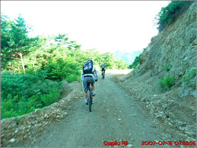 자리를 정리하고 털고 출발을 한다. 출발시간이 7시 50분이 다 되어 간다. 여느때 같으면 이시간이면 한참 차량으로 출발지로 이동하고 있을 시간.. 역시 야영라이딩의 위력 되겠다. 앞으로는 금요일밤 저녁에 출발지로 이동하여 야영하고 아침일찍 라이딩을 시작하여 오전중에 라이딩을 마무리 하는 형태로 진행하는데 모두 동의하신다..^^ 드디어 본격적인 야영라이딩은 이렇게 시작될 듯 싶다. 뽀송뽀송한 도토리 코스의 솜털같은 노면을 훑으며 지나간다.