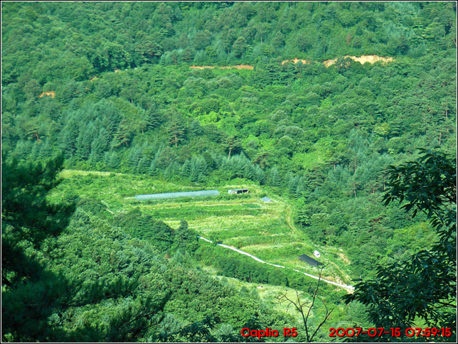 계곡을 돌아서니 어제 밤에 헤멘 지역이 멀리서 한눈에 들어온다. 위로는 임도가 보이고 밑에 수풀이 막아서고 있다. 그 수풀 앞까지 갔다가 결국 포기하고 다시 내려간 것이다. 불과 백여미터도 안되는 수풀을 못지나가서 돌아갔다는 것이 원통하고 믿기지 않는다. 간밤에는 GPS지도를 준비하지 않았는데 이게 그럴때 필요한 줄 생각하지 못했다. 도토리를 만만하게 본 탓이다. 아니.. 실제 임도와의 거리를 보면 만만한데.. 수풀에 가려지고 밤이라서 임도를 못본 탓이었다.. 그리고 오른쪽 하단에 교장님이 포기하고 가신 도랑에 빠진 하얀색 이스타나가  네모 모양으로 보인다. 맘이 아프다.. 휴.
