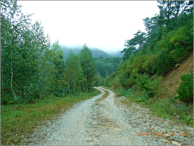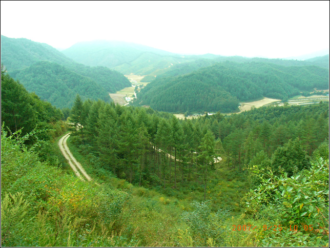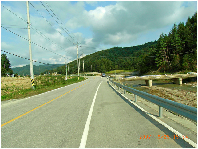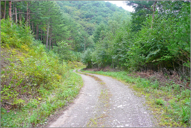 이어 나타나는 급한 콘크리트 딴힐경사.. 거기를 내려서면 구절리가 나온다. 작년 호우때 길이 끊겨 있던 구절리에서 왕산으로 가는 송천을 끼고 도는 비포장, 포장도로를 따라서 20여키로를 진행하면 원점이 노추산 임도입구에 다시 도착한다.