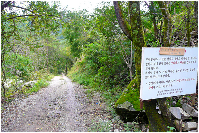아주 기초적인 정보를 토대로 배나드리 부근에 차를 파킹(3반장과 아이들을 차안에 모셔놓고..^^)하고 홀로 도암댐으로 개천을 따라 거슬러 올라갔다. 하지만 가는 입구를 못찾아 배추밭을 헤메기도 하고.. 차가 지나간 밭두렁의 뻘밭을 수차례 지나 돌밭이 우르르 쏫아지는 고개도 하나 넘고.. 결국 발왕사로 가는 포장로를 발견하게 된다. 발왕사는 배나드리에서 도암댐으로 가는 중간에 있는 사찰이다. 입구에는 장뇌삼 경작지가 사찰근처에 있음을 알리는 안내문도 보이고..