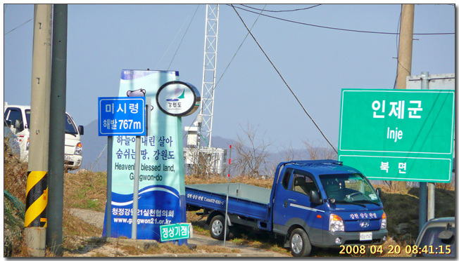 해발 767미터의 미시령 정상 표식.. 인제군과의 경계임을 알리는 이정표도 있다.