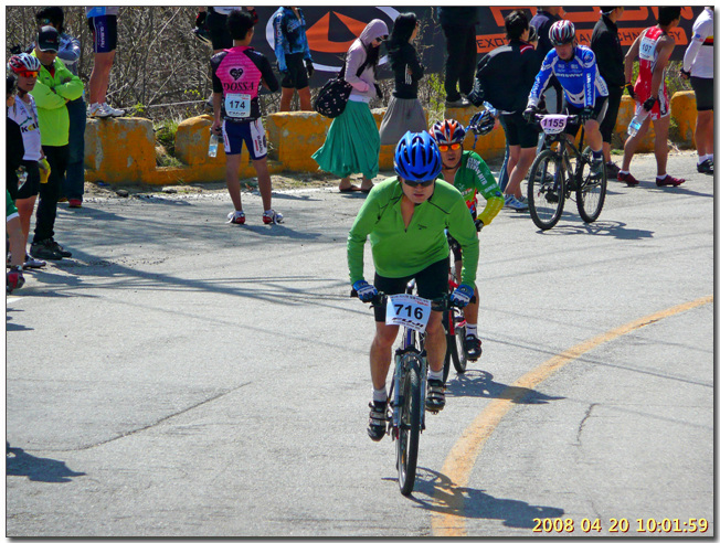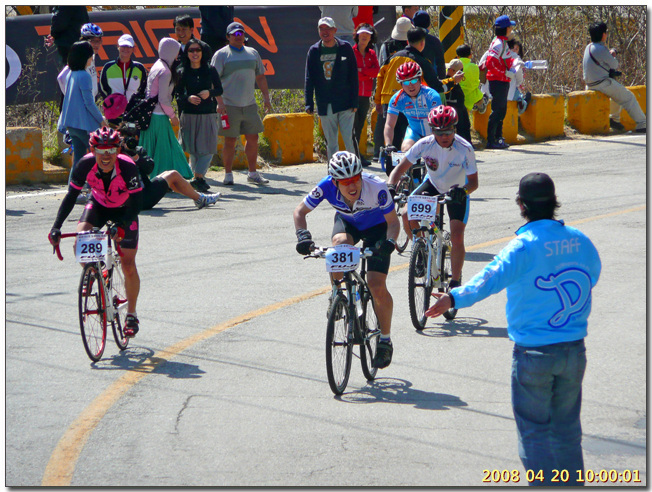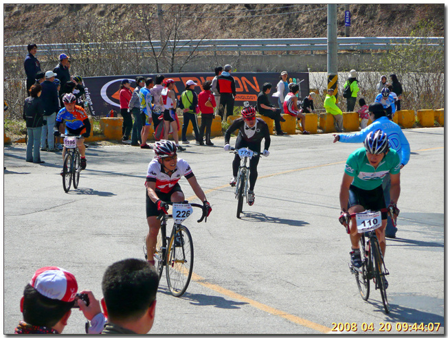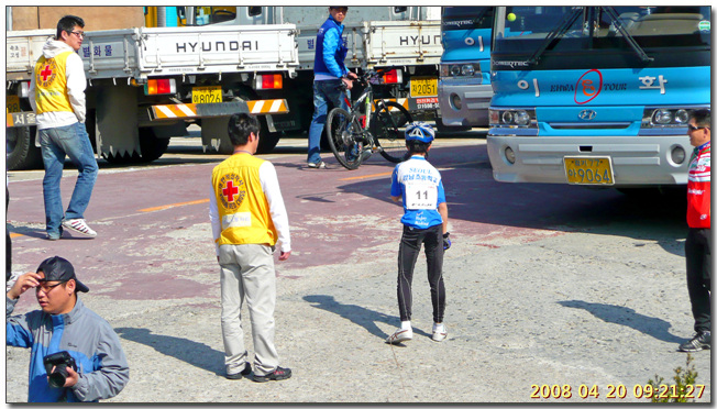 하지만 피니쉬라인 즈음에서 확인해 보니 초등생이다.. 10키로 쥬니어 선수가 먼저 도착한 것.. 쥬니어 1등이 보무도 당당하게 골인.. 최선을 다했는지 잔차에서 내릴힘도 없어 보인다. 잔차에서 내려서 휘청이는 학생을 의무요원이 다가가 확인하고 있다.. 장하다..^^