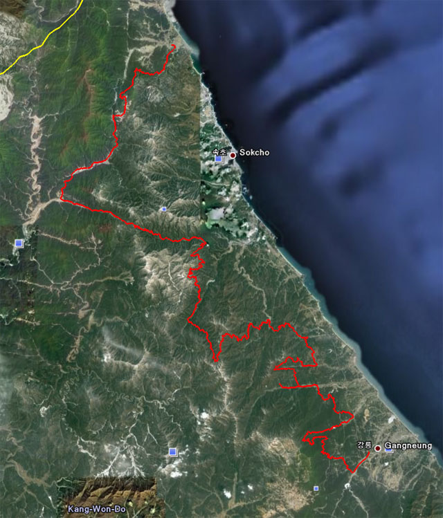 장소는 강릉에서 간성에 이르는 동해안 산간 임도길입니다.
