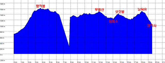 첫날 우리의 마지막 업힐코스인 무령산정상이 멀리 보인다.