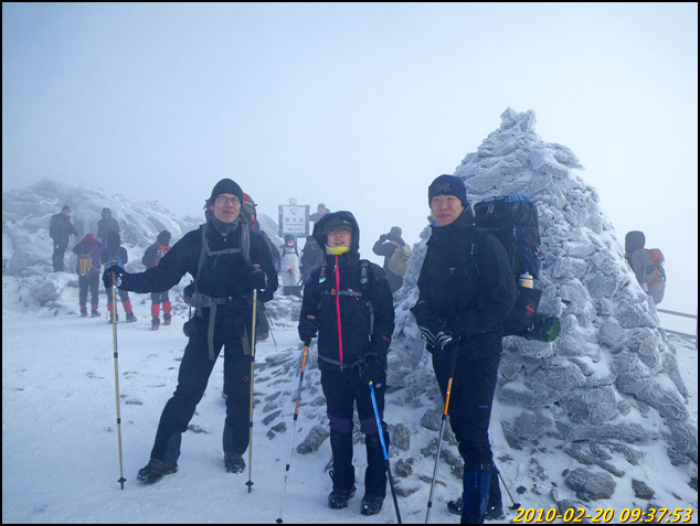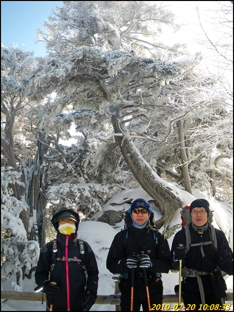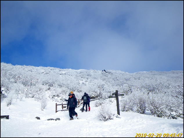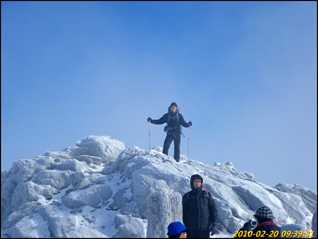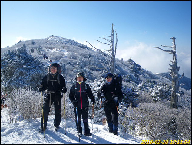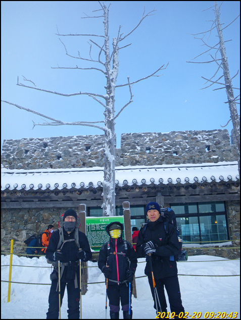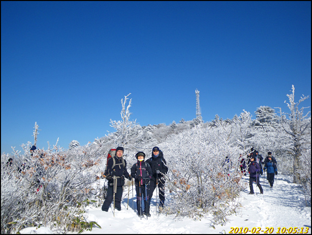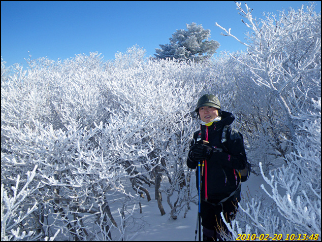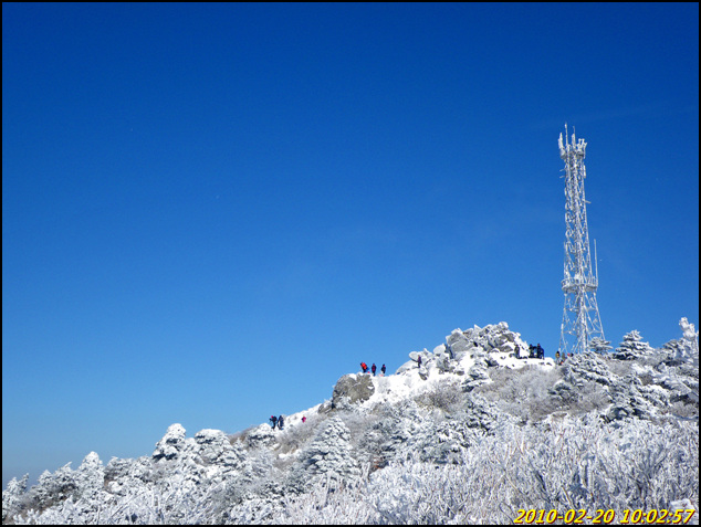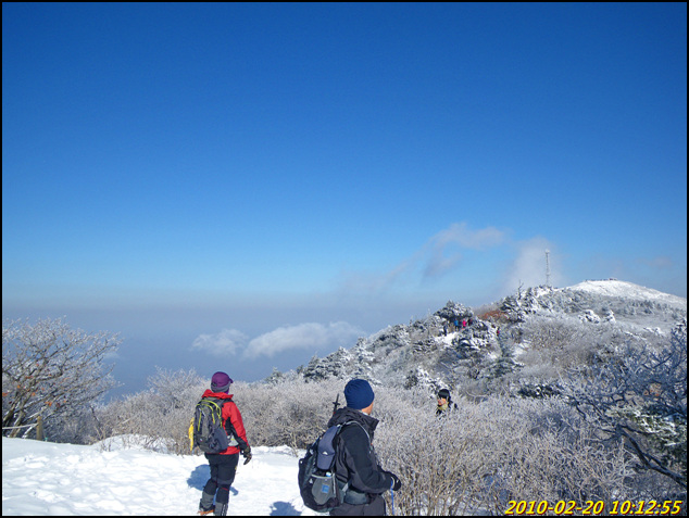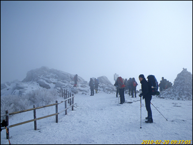 향적봉 정상의 바위에는 서리가 가득내려 온통 하얗게 보인다.