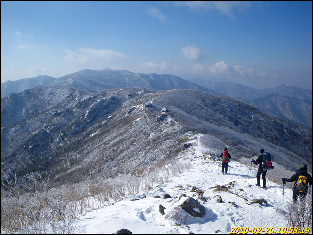 우리가 지나온 방향의 백두대간 능선길이 멀리 펼쳐져 있다.