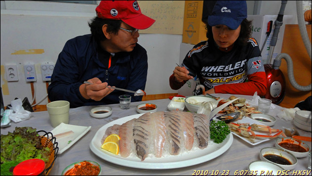 두툼한 우럭회에 매운탕으로 라이딩의 피로를 달랜다.