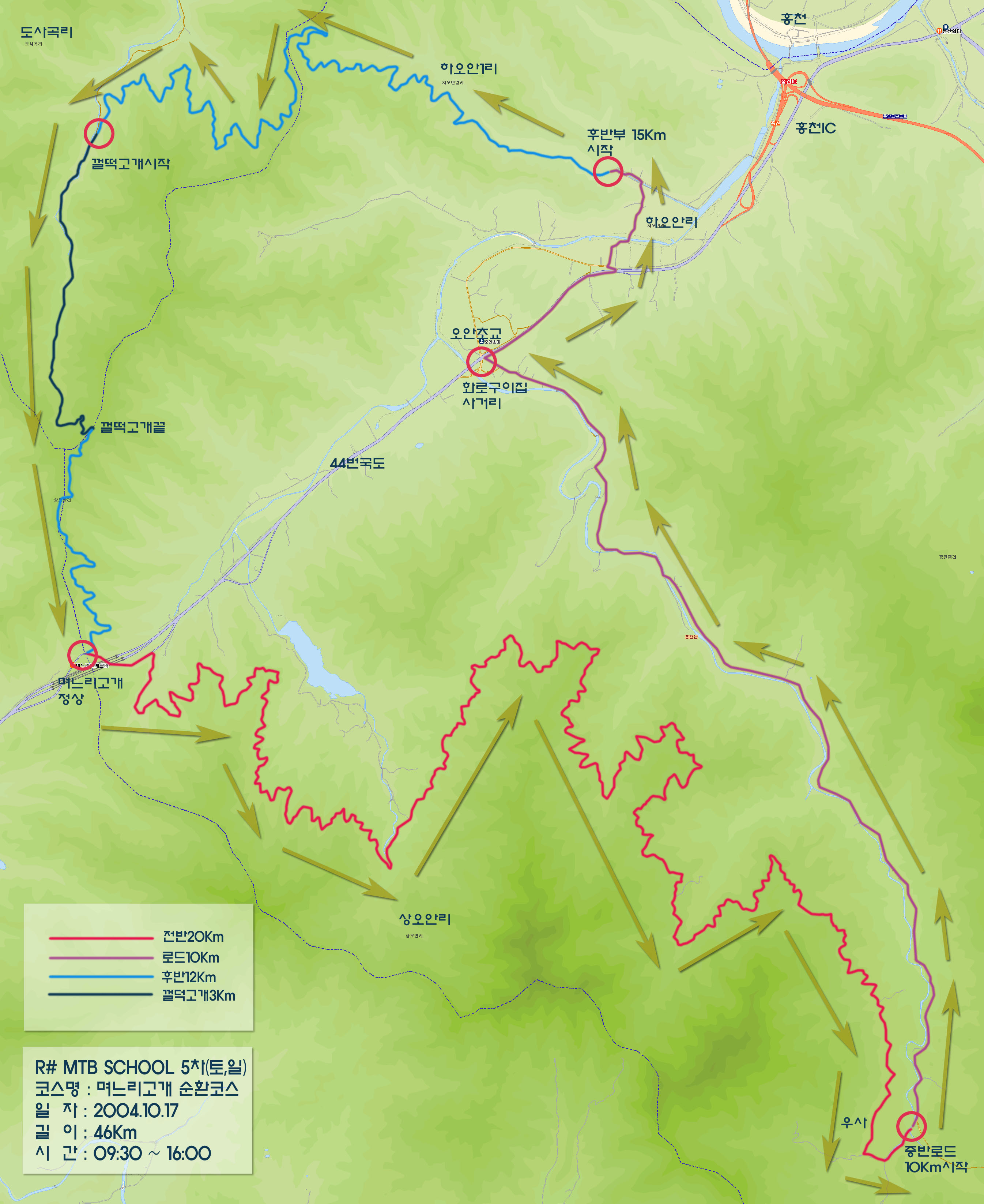 자 드디어 로드의 기나긴 딴힐이다. 우리가 올라왔던 모든 길을 내려간다. 본인도 모르게 금새 10Km를 시원하게 지날 수 있다. 44번 국도를 만나고 홍천쪽으로 진행하다 내리막을 내려와 하오안리쪽으로 국도를 가로질러 진입한다. 하오안1리쪽으로 이리저리 작은 갈림길(복잡해 보이지만 진입 계곡을 바라보면서 그쪽 방향으로 계속 진행하면 됨) 지나면 후반부 15Km지역 입구에 들어선다.