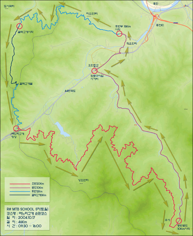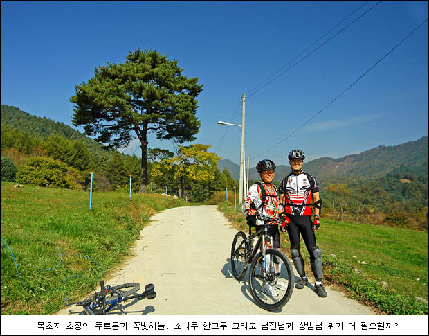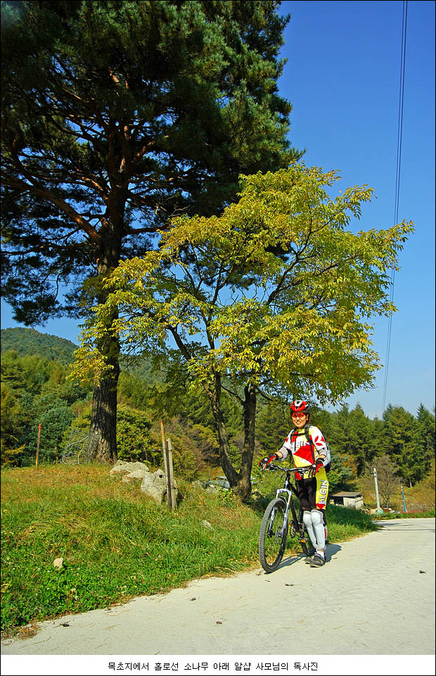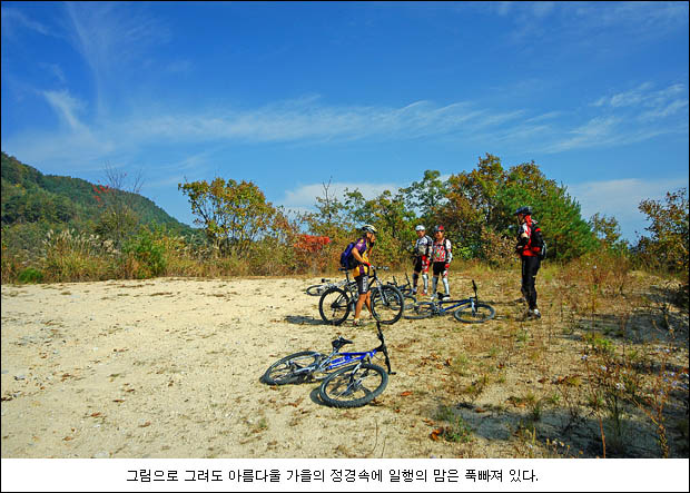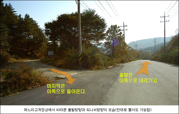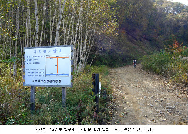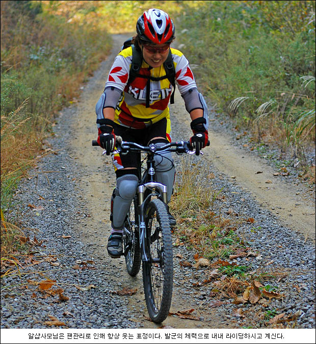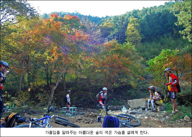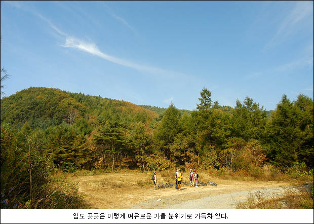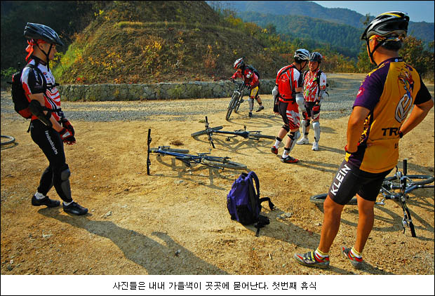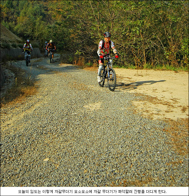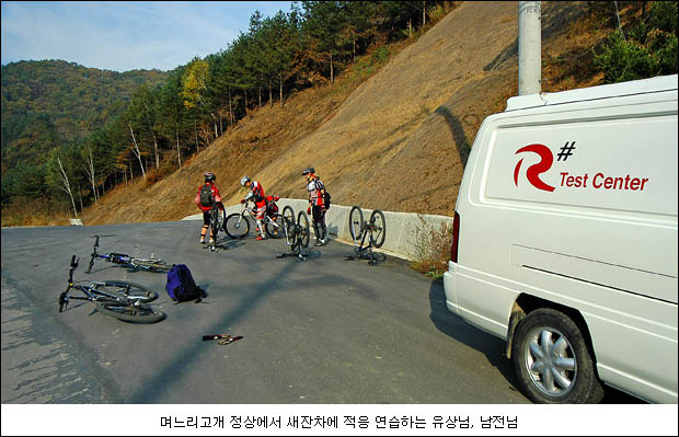 아침에는 자켓에 긴바지를 입고도 추위를 느낄 정도였는데 해가 나고 스트레칭을 하고나선 모두 옷을 벋어 제쳤다. 반바지에 긴팔 쿨맥스티하나만 입고 고개를 잠깐 다운힐 하는 동안 바람이 꽤 차다. 고개 정상에서 홍천방향으로 다운힐 하다 오른쪽 콘크리트 포장 임도입구가 보인다. 며느리 고개코스는 총 3개로 나눌 수 있다. 전반 임도, 중반 로드, 후반 임도이다. 총연장은 45Km이다. 전반 20Km, 로드 10Km, 후반 15Km이다. 전반임도는 완만한 업다운힐이 반복되고 노면상태는 건축용 잔자갈을 많이 깔아놓아 업힐시에는 타이어 그립이 약해 자주 자갈밭에 빠지며, 딴힐시에는 앞바퀴까 빠져 자빠링의 위험이 많다. 다듬어 지지 않은 도로에서는 날카로운 굵은 자갈이며 흙무더기들이 눈에 띈다. 모두 조심해야 업힐시 페달링의 효과를 반감하는 요소들이다.