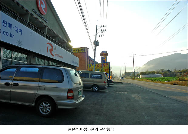 일요일 아침길을 달려 알샵에 도착하니 어김없이 7시를 가리킨다. 매주 토, 일요일에 알샵까지 자동차를 몰고오는 것이 아주 익숙해져서 있어 부담이 없다. 새벽길은 차의 통행도 한산하고 과속하지 않고도 늘 한시간 남짓사이에 알샵까지 오게된다. 주말 라이딩을 그리워 하다 매주말 이렇게 잔차를 타고나면 한주를 드디어 마무리 했다는 느낌이 든다. 오늘은 어제 배상범님, 유상님, 남전님이 미리 와계셨다. 간밤에 늦게까지 酒님과 함께 하였다고 한다. 밖은 추운 날씨인데 그에 반해 알샵의 따듯한 시즌방에서 이리저리 소주잔을 기울이셨을 님들을 상상하니 내심 부럽기도 하다. 난 토요일마다 행사가 잦다. 두주째 일요일반에 참석할 수 밖에 없었다. 덕분에 그사이 남전, 유상님과의 라이딩도 내겐 각별해 졌다. 말로만 듣고 처음뵙는 배상범님도 반가왔다. 늘 보아오던 사이처럼 정겹게 말을 건넨다. 운동으로 다져진 각진 몸이 돋보이는 청년같은 배상범님이었다. 듣던 그대로 한체력하게 생기셨다.