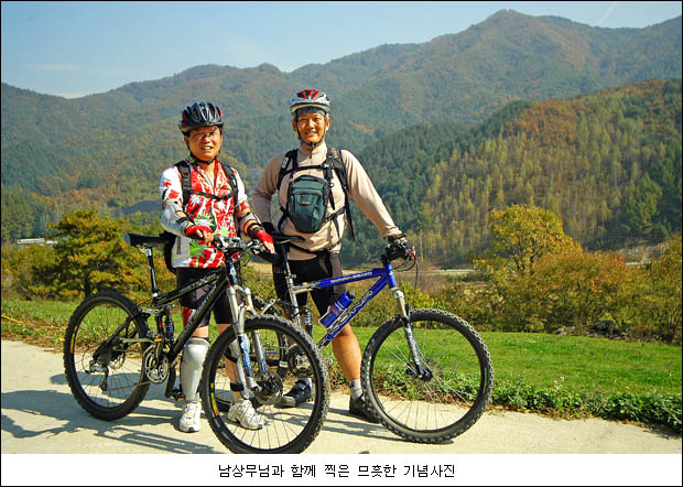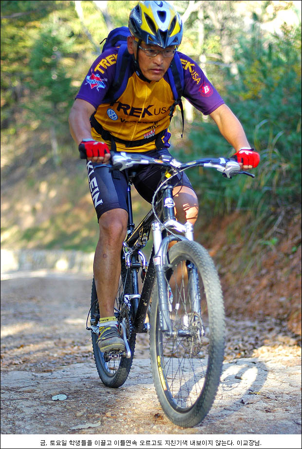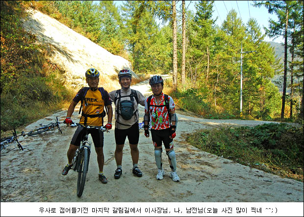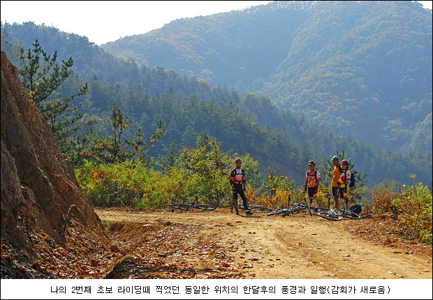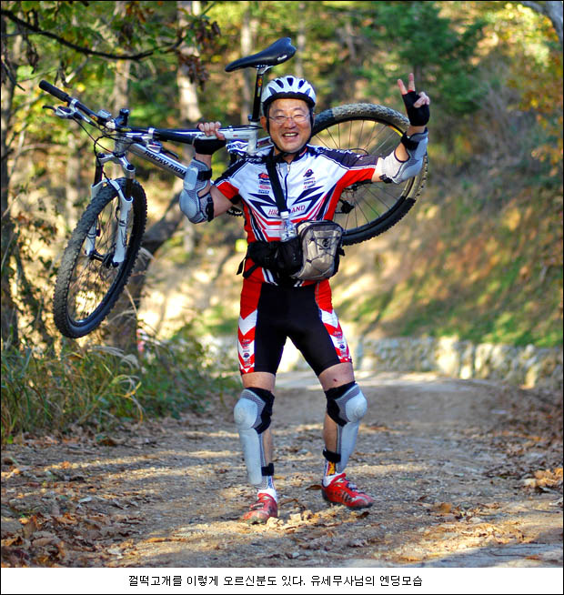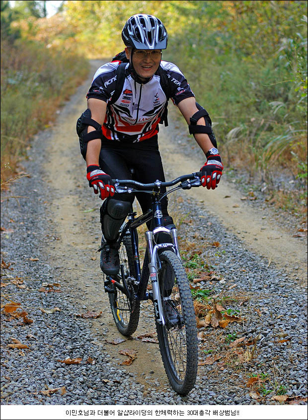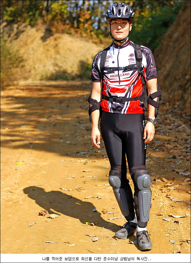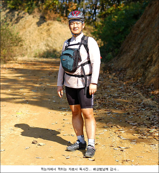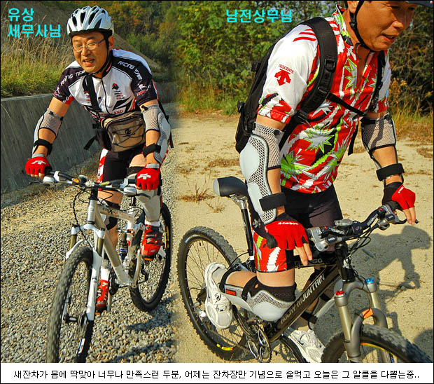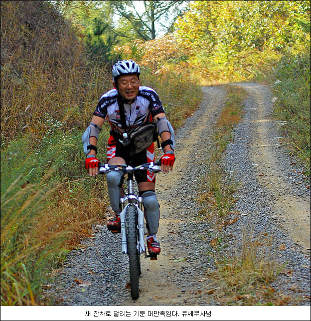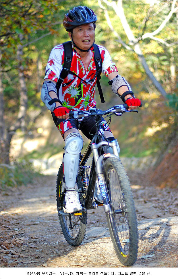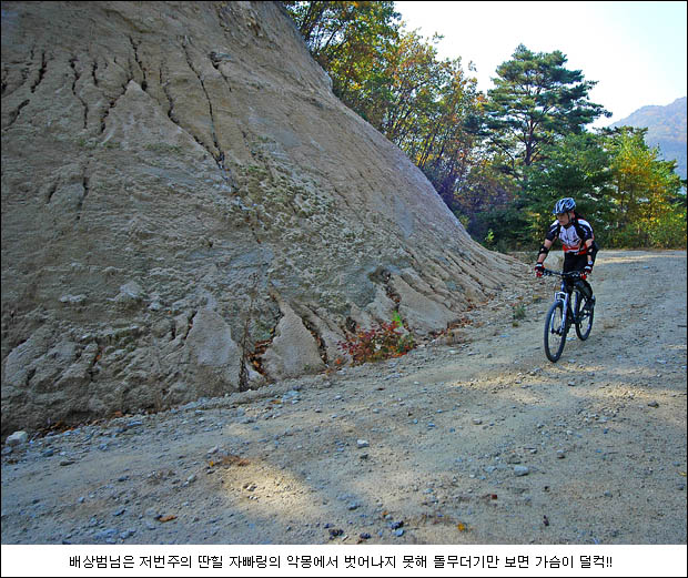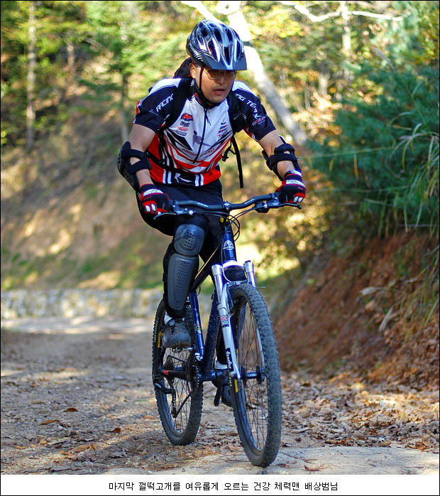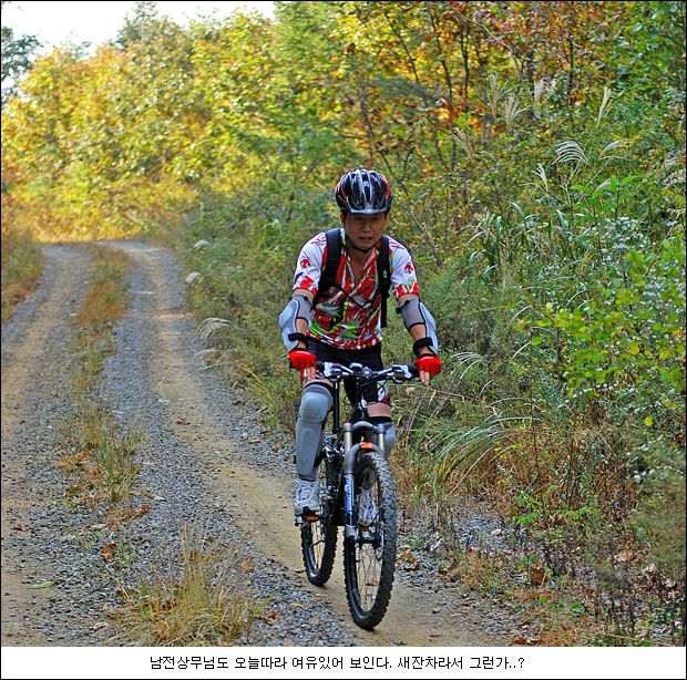 배상범님은 전주의 자빠링악몽을 벋어나지 못하고 있다. 오늘은 완전무장하셨다. 무릎, 팔꿈치 보호대는 기본이고 전주에 혼난 왼쪽 엉덩이 보호용으로 양 엉덩이를 수건으로 두툼하게 감싸셨다. 특히 딴힐에서는 속도를 최대한 자제하는 모습을 보여줬다. 전주의 기억을 털어버리려면 상당시간 딴힐에 대한 확신이 생길때까지 천천히 다니시겠다고 한다. 반면에 업힐은 정반대다. 힘찬 기세로 쭉쭉치고 나간다. 마치 이종화박사님을 보는 듯했다. 체력에 대한 자신감이 강한 듯하다. 겨우겨우 배상범님을 따라 올라간다.