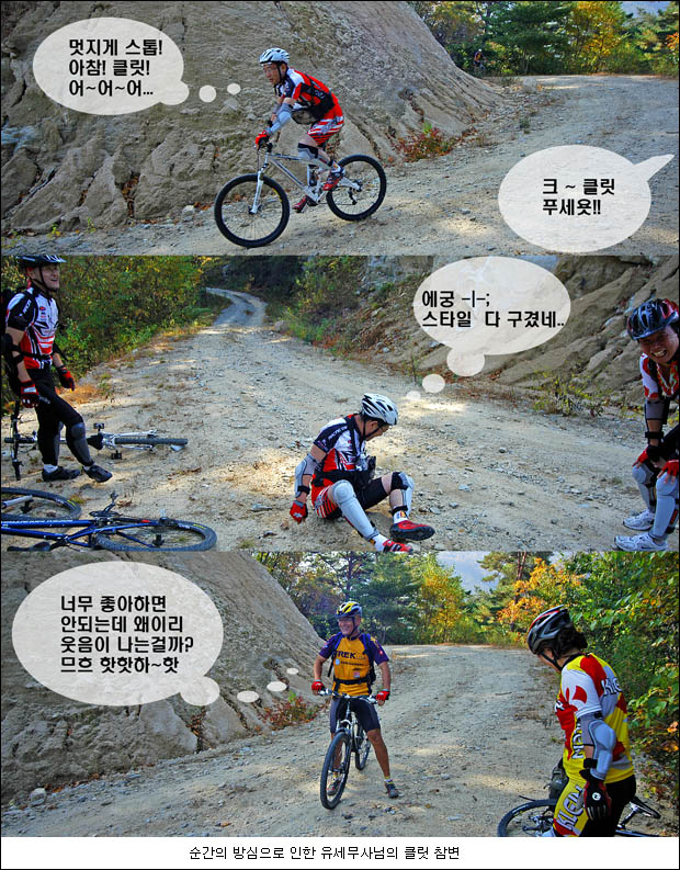 한참을 올라서다가 그늘을 찾아 잠시 쉰다. 모두가 하나둘 부지런히 올라오신다. 유상세무사님은 처음 잔차를 사고서 클릿을 새롭게 경험하는 하루가 된다. 클릿을 유난히 의식하고 올라오신 탓으로 매번 혹시 클릿이 벋어지지 않으면 어떻할까 고민에 고민을 거듭하신다. 그럴때 마다 알샵사모님이 옆에서 충실하게 클릿에 대한 멘트를 던지신다. “클릿 푸세욧!!”.. 이제 적응하실 때도 됐는데.. 쉼터에 진입하는 모습이 다소 지친모습이다. 힘들어서 인지.. 아님 알샵사모님의 “크~ 클릿”소리가 잘안들리셨는지.. 갑자기 정지하시더니 순간~ ~ 멋지게 옆으로 철퍼덕 뒹굴링하신다. 생생한 당시의 모습을 다행히(?) 몇컷으로 표현이 가능했다. 도저히 놓칠 수 없는 순간이라. 사진으로 재구성해봤다. 유세무사님은 넓은 마음으로 너그러이 이해해 주심 감사하겠습니다.