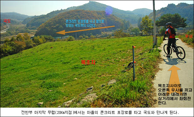 전반후 끝무렵은 마을 도로라서 임도와 같이 상세하게 표현되지는 않았다. 임도가 끝나고 마을쪽으로 올라 가다보면 목초지가 양옆으로 보이고 우사가 오른쪽으로 보이는 좁은 콘크리트 포장로다. 목초지에서 보이는 건너편 국도며 호젓한 소나무 한그루를 배경으로 셔터를 눌러본다.