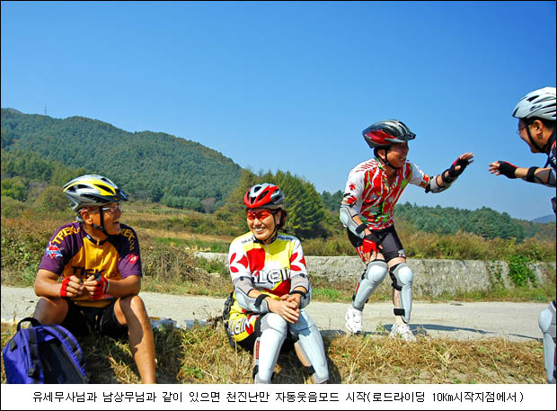 오늘은 유세무사님과 사모님의 리드가 좋다. 크게 뒤쳐지지 않고 금새 중간 쉼터에 합류하신다. 역시 몸에 맞춘 잔차가 값을 하는 모양이다. 첫휴식에 유세무사님과 남상무님의 표정이 밝다. 아주 흡족하신 모양이다. 유상님왈 갑자기 실력까지 업그레이드 되셨단다. 이렇게 좋은걸 왜 몰랐을까 진작 살껄 하셨다. 남전님도 마찬가지.. 두분다 새로산 잔차에 대해 경외감을 가지셨다. 오늘은 라이딩이 스피디할 것 같다. 펄펄 날라다니실 두분이 기대된다.