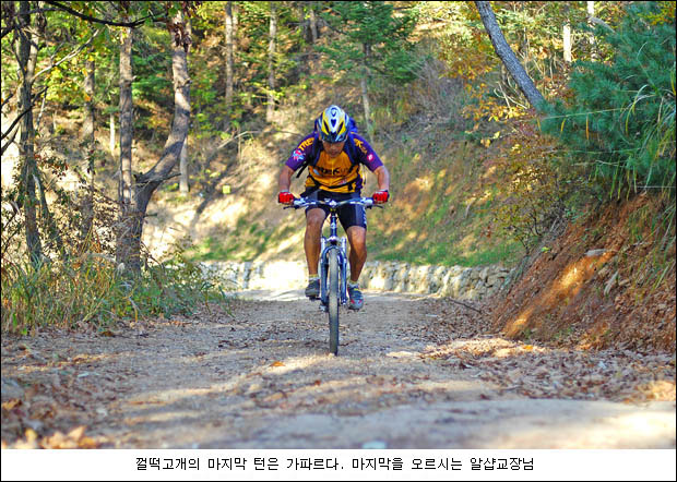 껄떡고개는 3키로의 인정사정없는 업힐이다. 부분부분을 잘라놓고 보면 그다지 경사도가 없지만 근육의 피로를 회복할 여유를 주지않는 일정수준이상의 경사가 계속 이어진다. 그러다 보니 나의 둘째주 라이딩에서는 중간에서 걸어갈 수밖에 없었다. 하지만 이번에는 그동안의 축적(비록 한달여지만)한 깡다구로 밀어부쳤다. 역시나 허리에 조금씩 통증이 오고 심장은 터질듯 안으로 부터 팽창한다. 하지만 분명 한달전과는 다르다. 쉴만한 곳이 아닌 곳에서 숨을 돌리는 여유도 가져보고 하나 둘씩 악명높은 고개을 오르다보니 분명 정상은 보였다. 알샵 라이딩을 거듭하면서 나중에 반드시 한번 한호흡에 올라보리라 다짐했던 코스라 의미가 상당히 깊다.